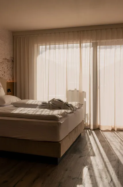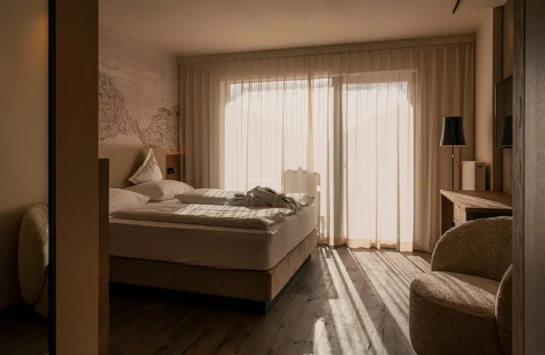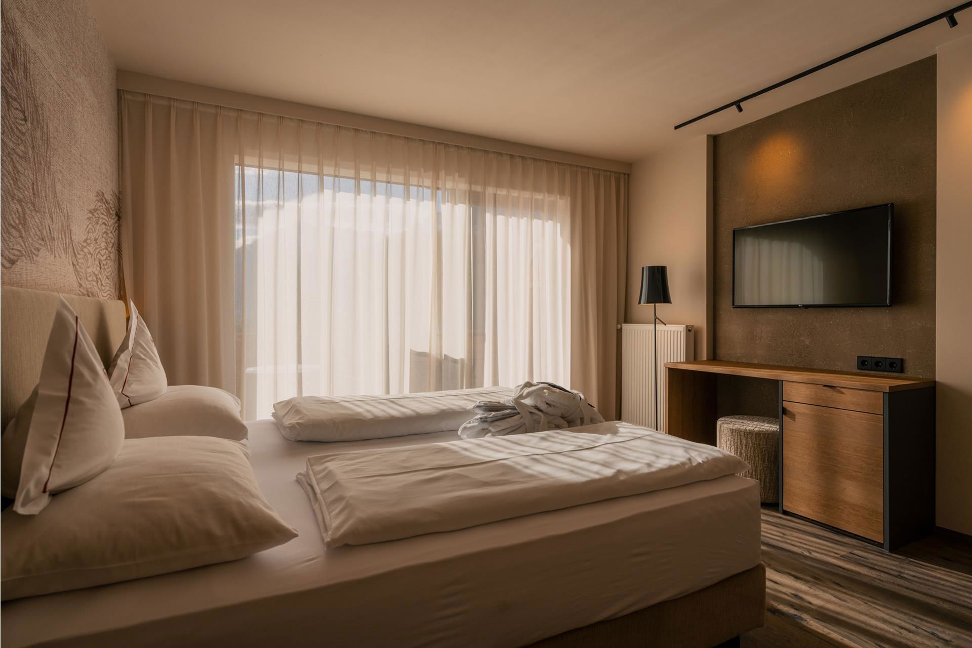 Newly designed Signature premium room featuring high-quality parquet flooring and an enclosed south-west facing balcony with panoramic views of Schenna Castle.