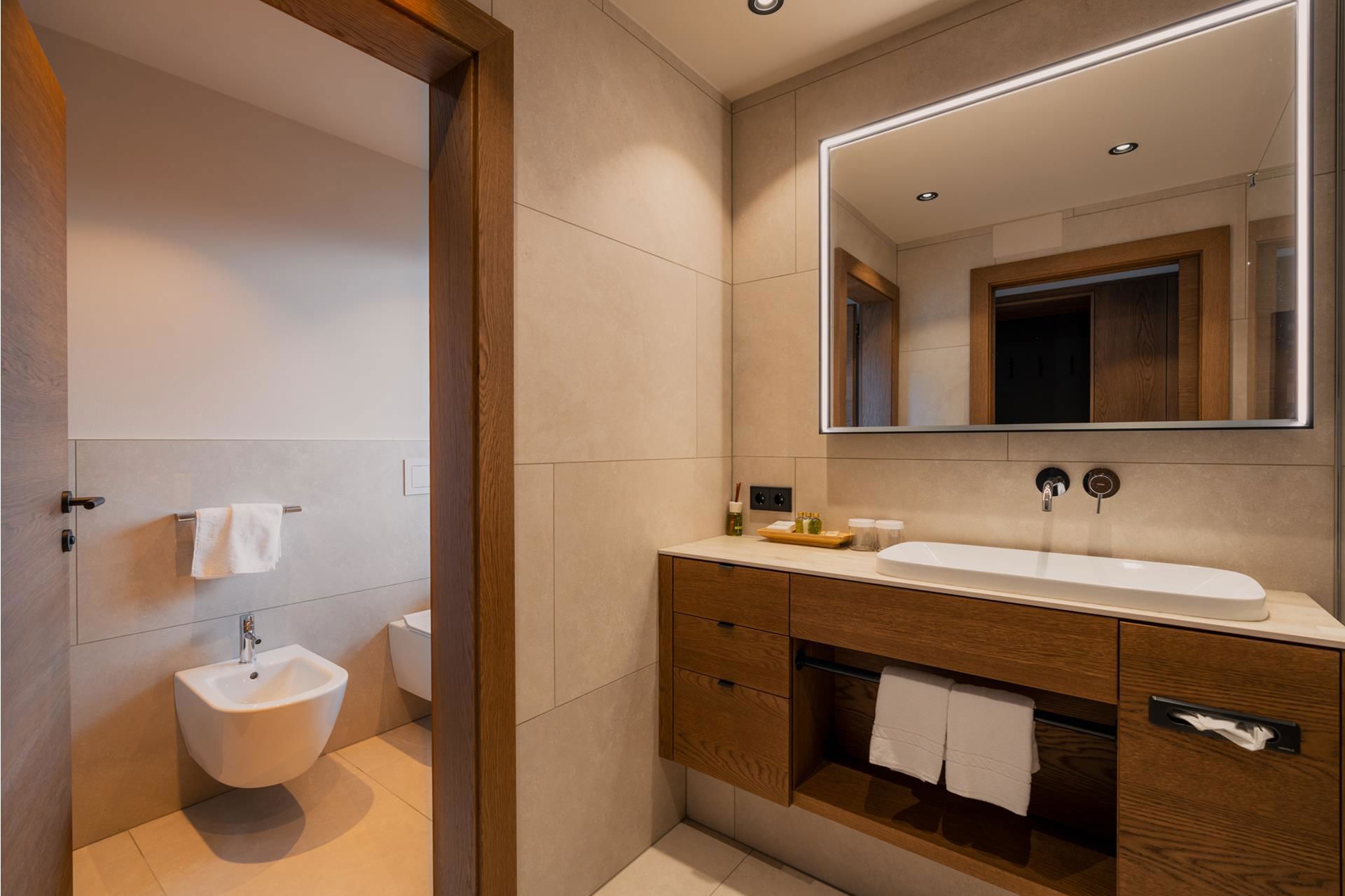 The modern-designed bathroom blends harmoniously into the overall room concept.