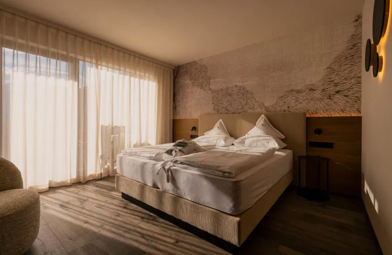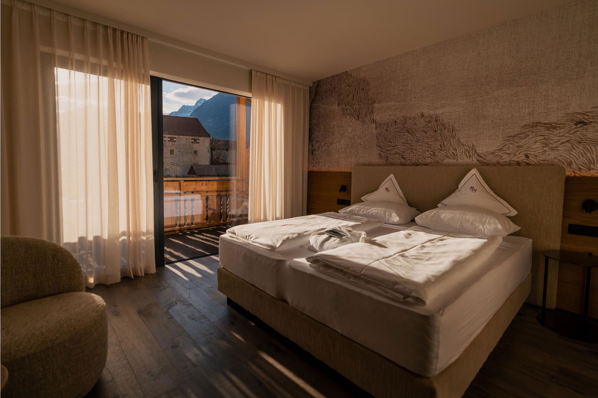 Newly designed premium room featuring high-quality parquet flooring, clean lines and a south-west facing balcony with panoramic views of Schenna Castle.