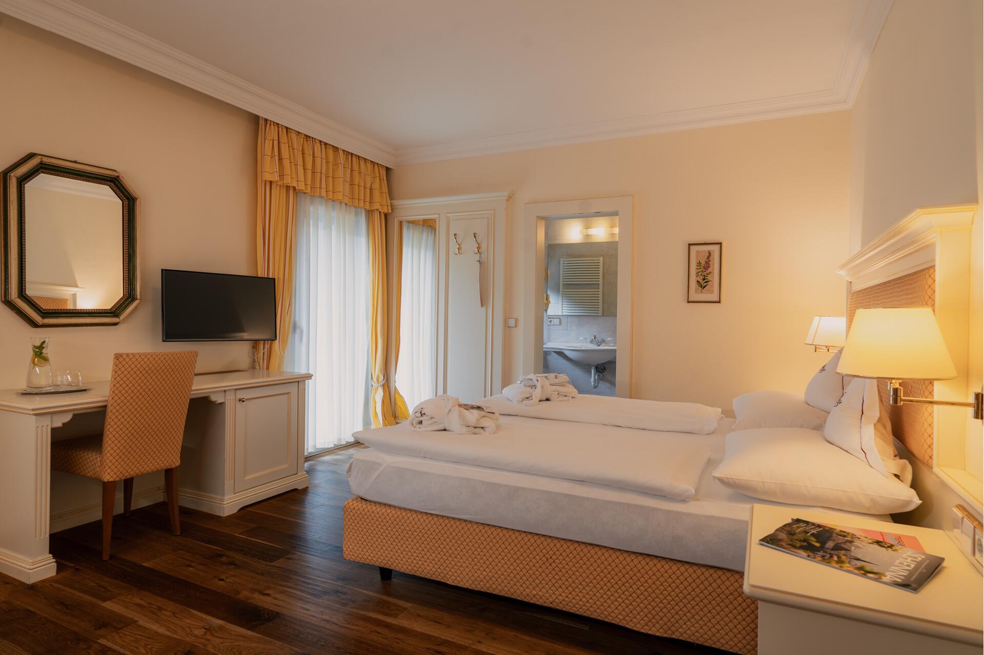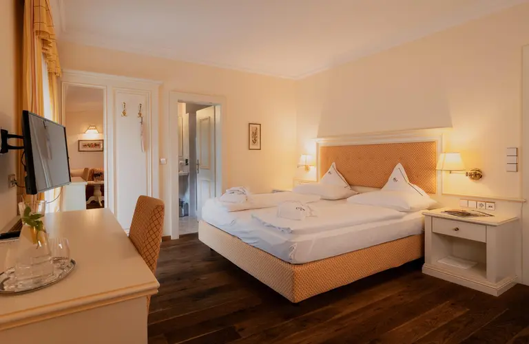 With balcony, shower or bath, living room section, WC, partially with bidet, hair drier, radio and TV, telephone, wall safe, frigobar, some with parquet flooring.