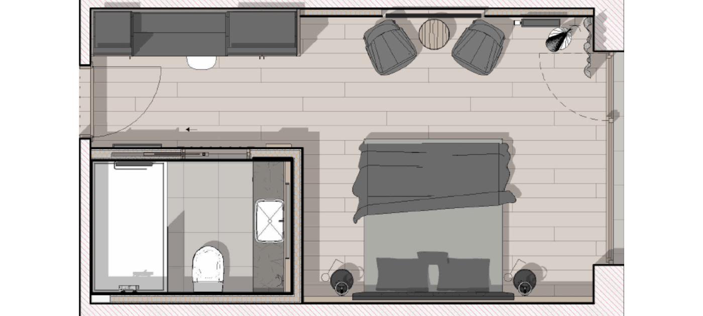 Il bagno a vista, realizzato con superfici moderne, si integra armoniosamente nel concetto della camera.