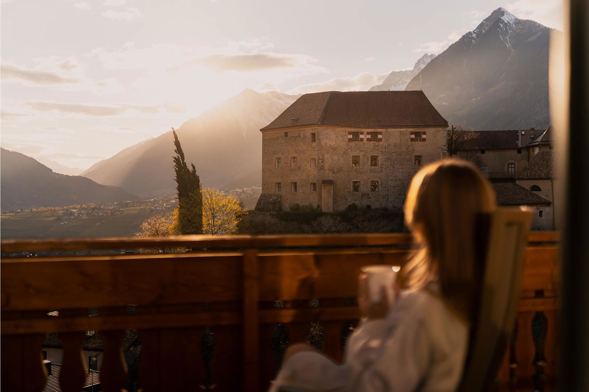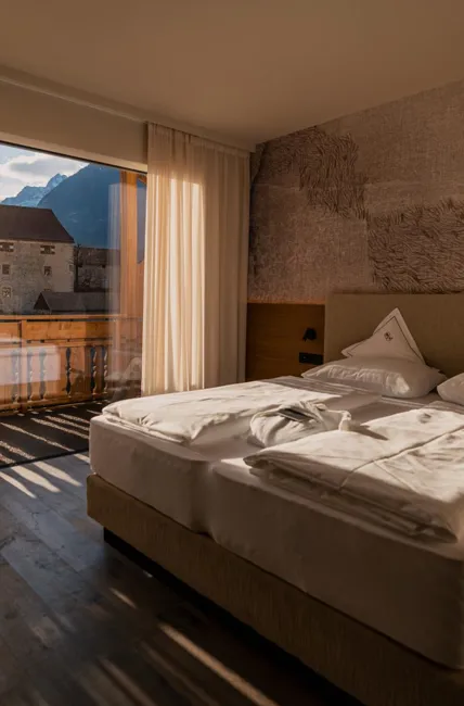 Camera premium dal design rinnovato con pavimento in parquet di alta qualità, linee pulite e balcone esposto a sud-ovest con vista panoramica sul Castello di Scena.
